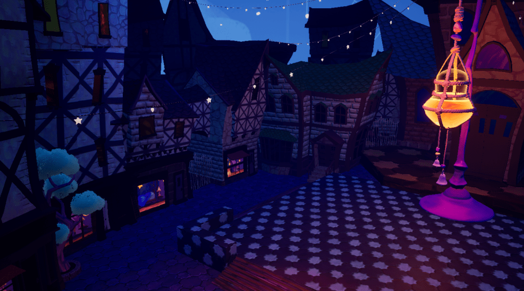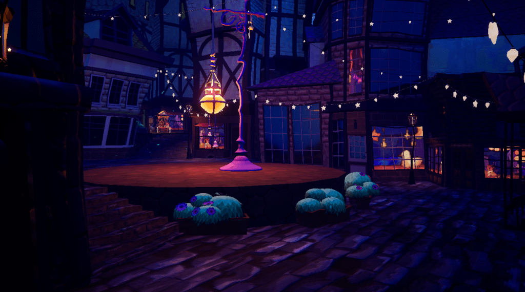 - For set dressing, I was assisted by a team of specialized set dressers in bringing the level to life using a freshly updated environment kit. During this section, we discovered that due to the sheer size of our building assets, it wouldn’t be possible to keep sight lines as clear as I had originally planned; I compensated for this by campaigning for a bigger final witch-ball and lighting that could be seen over the buildings.