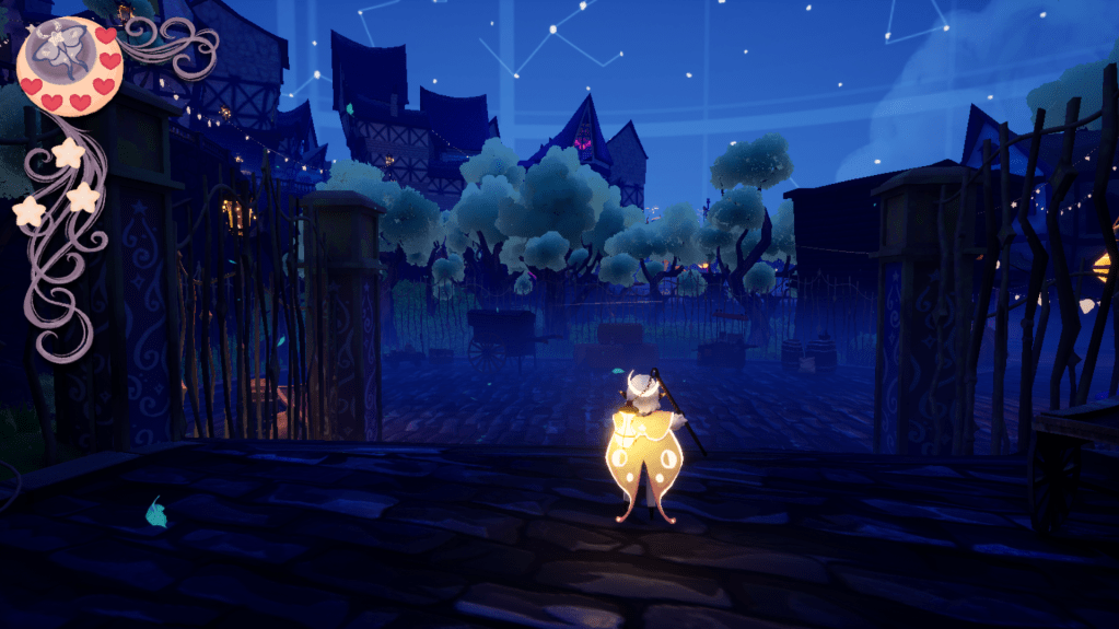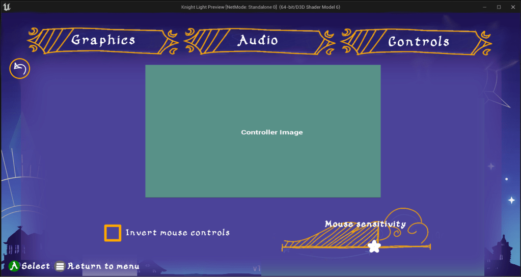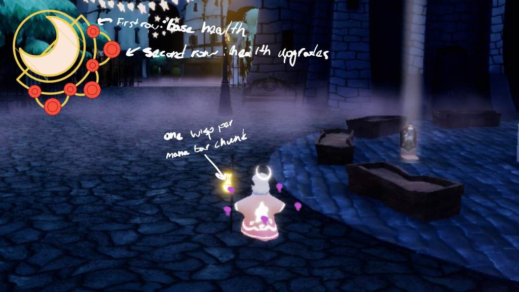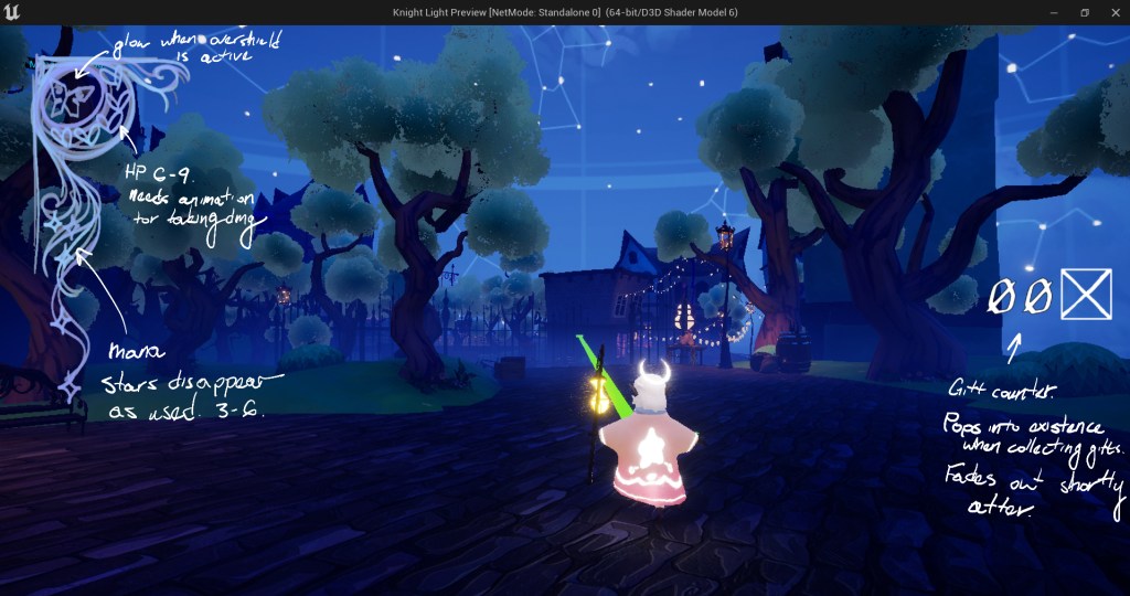 Knight Light has mechanics for HP and mana; beyond that, we wanted the HUD to be as bright and ethereal as Ptolemy. We went through several iterations of the design, experimenting with Victorian-style ornamentation and painterly strokes and colors. Ultimately, we settled on the crescent moon design, using winding tendrils to visually anchor the element to the screen.