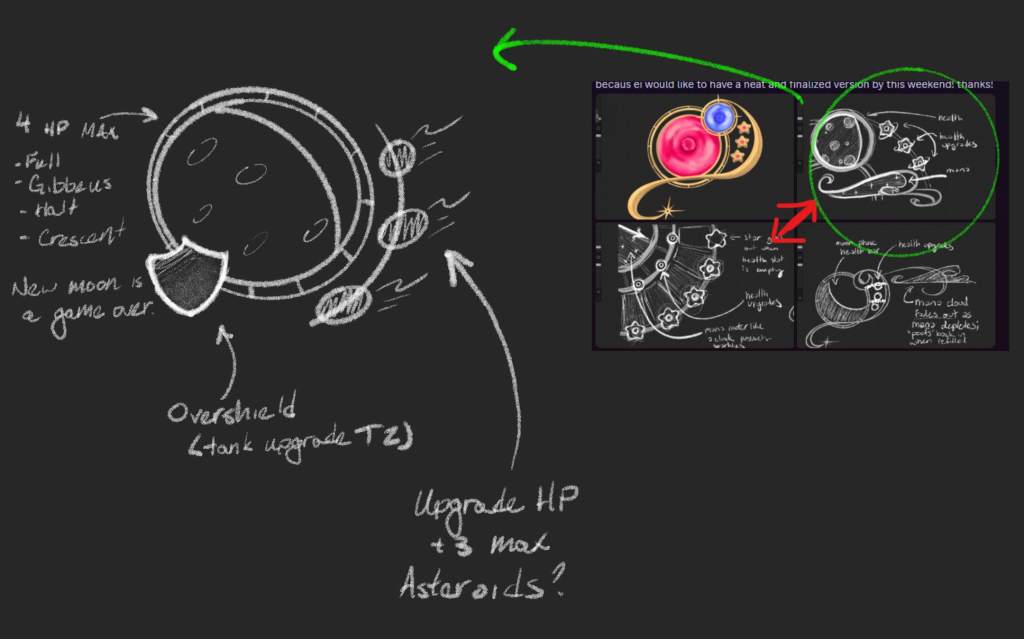 - In the plans of the upgrades menu, there were supposed to be passives which would also be tracked on the HUD. Gifts were supposed to act like currency, which also needed to be tracked. You can see some of these considerations in the wireframes below.
