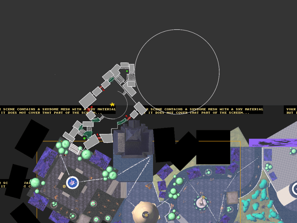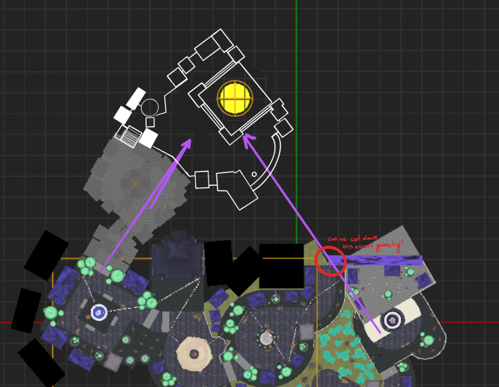 Screenshots I shared with the team, advocating for long sight lines to the final witch-ball.